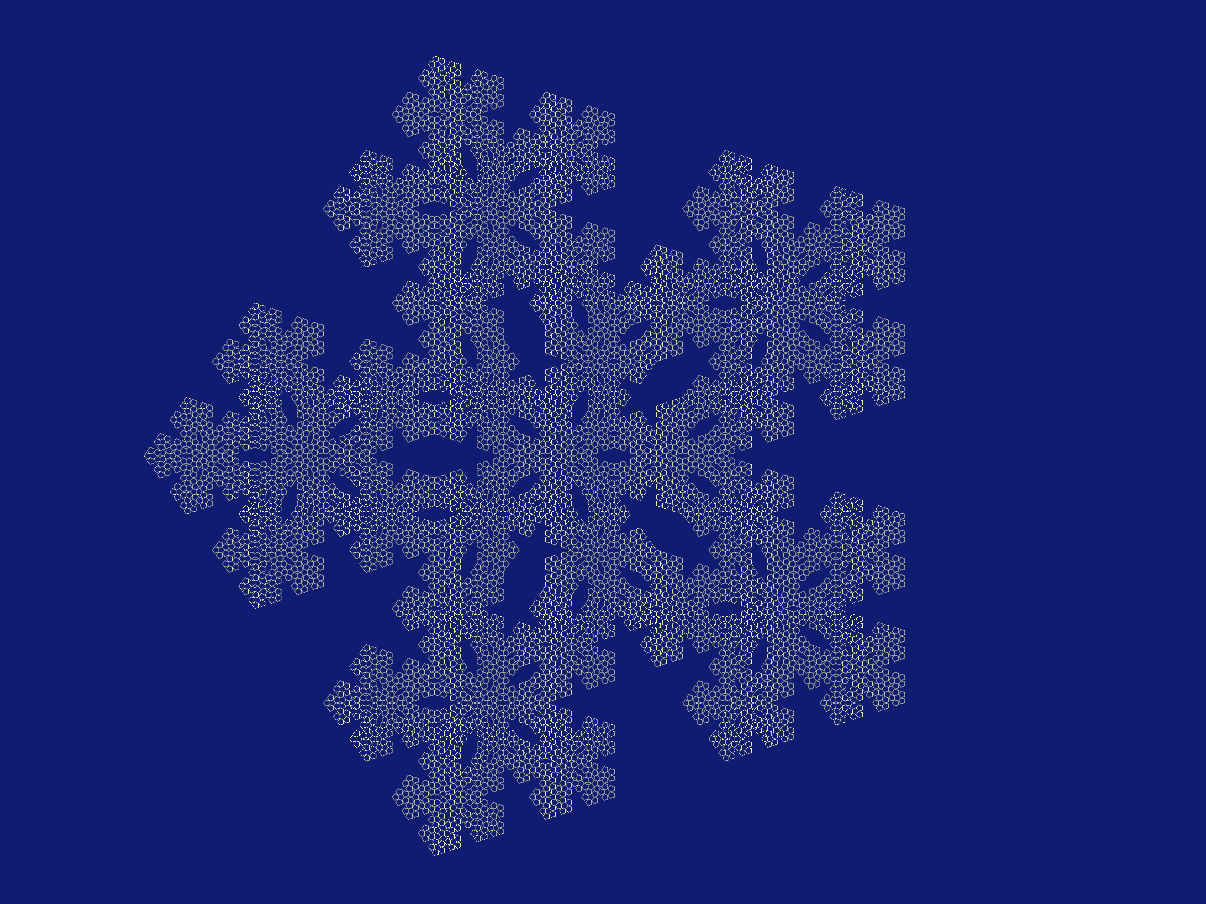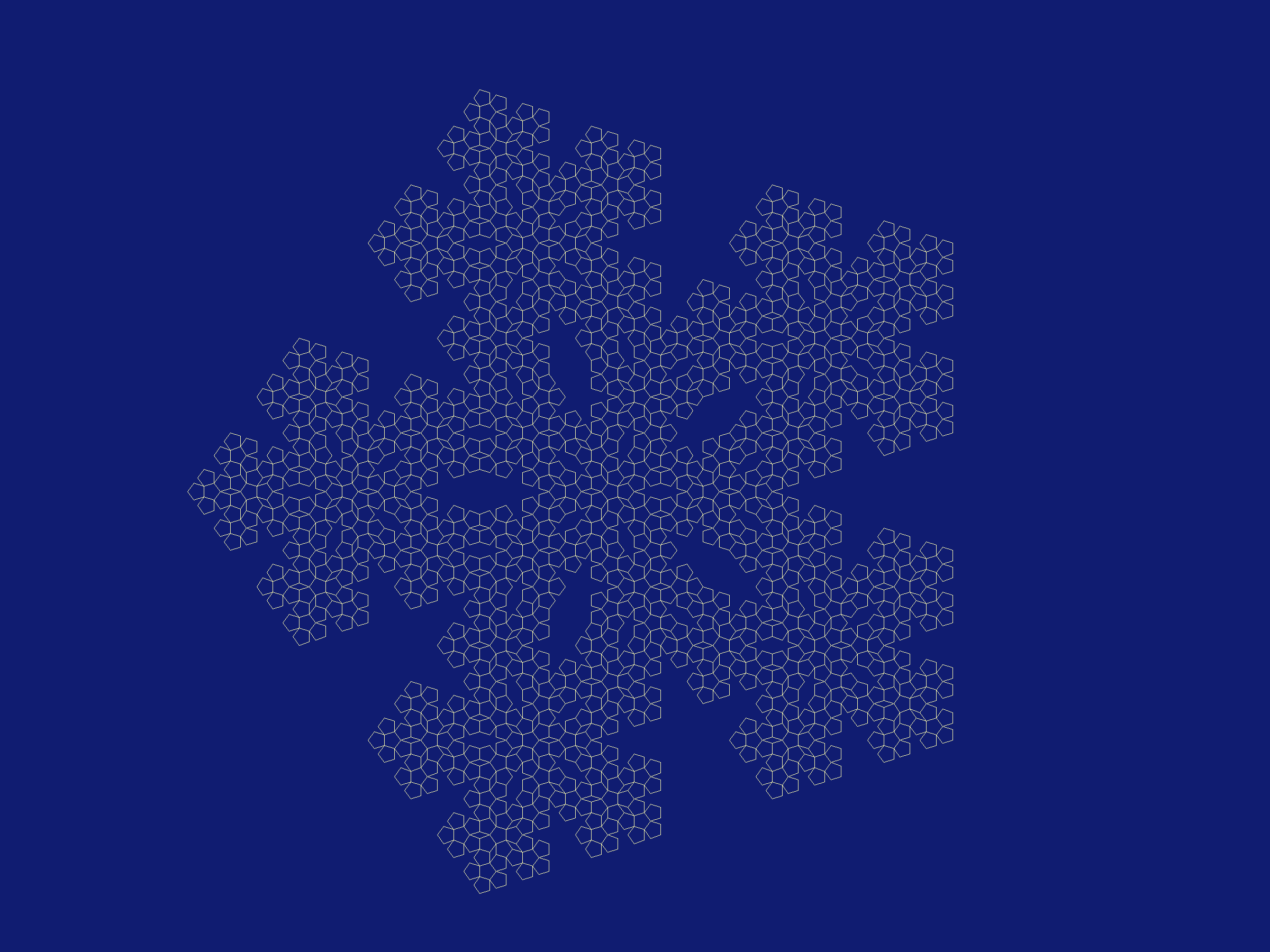 Lindenmayer-Systeme beruhen auf sogenannter "Textersetzung". Anhand der folgenden Bilder ist zu sehen, wie mit "Textersetzung" immer komplexere Strukturen entstehen. Das erste Bild zeigt die Grundstruktur - ein Fünfeck. Die folgenden Bilder sind jewels durch einen weiteren Schritt der Ersetzung entstanden. Jede Kante des Fünfecks wird zu einem neuen Fünfeck ausgebaut. Damit die Bilder gleich groß bleiben, wird die Kantenlänge des Fünfecks, mit dem begonnen wird, immer kleiner.